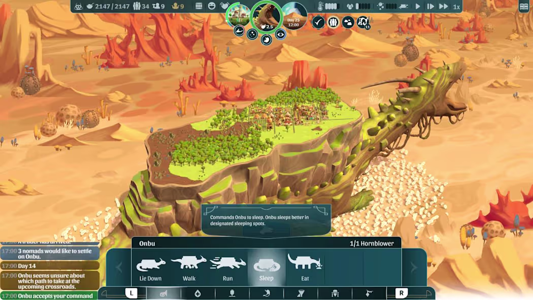 A proposta central do jogo é imediatamente envolvente. Em vez de um terreno fixo, sua cidade vive, literalmente, nas costas de um lagarto gigante chamado Onbu. Essa simbiose define quase todas as suas decisões: você não apenas constrói e coleta recursos, mas também precisa cuidar da saúde e da confiança de Onbu, influenciando seus caminhos e decisões.